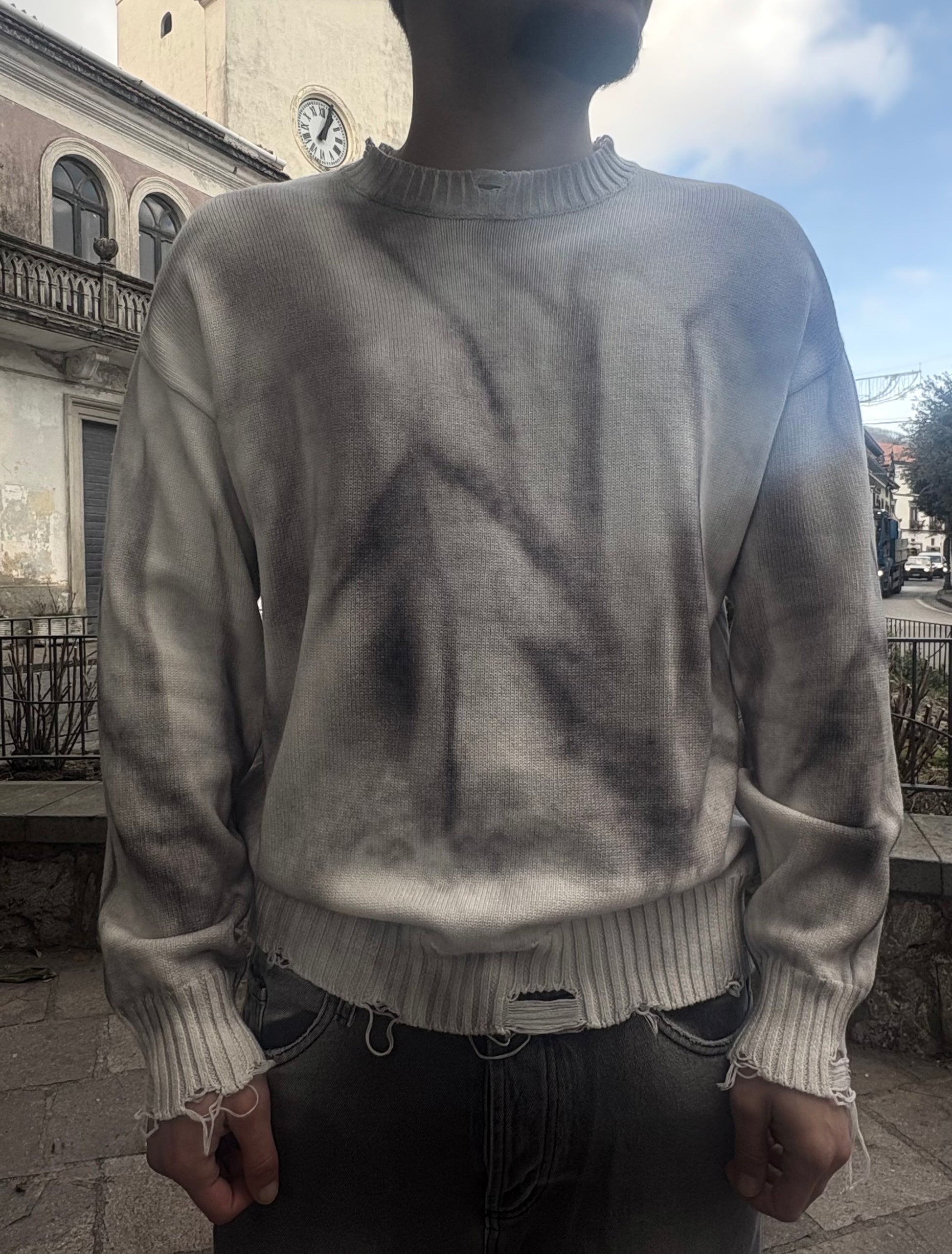 Maglioncino con design effetto sfumato. Collo, polsini e orlo inferiore strappati. Tessuto 100% cotone. Fit oversize.